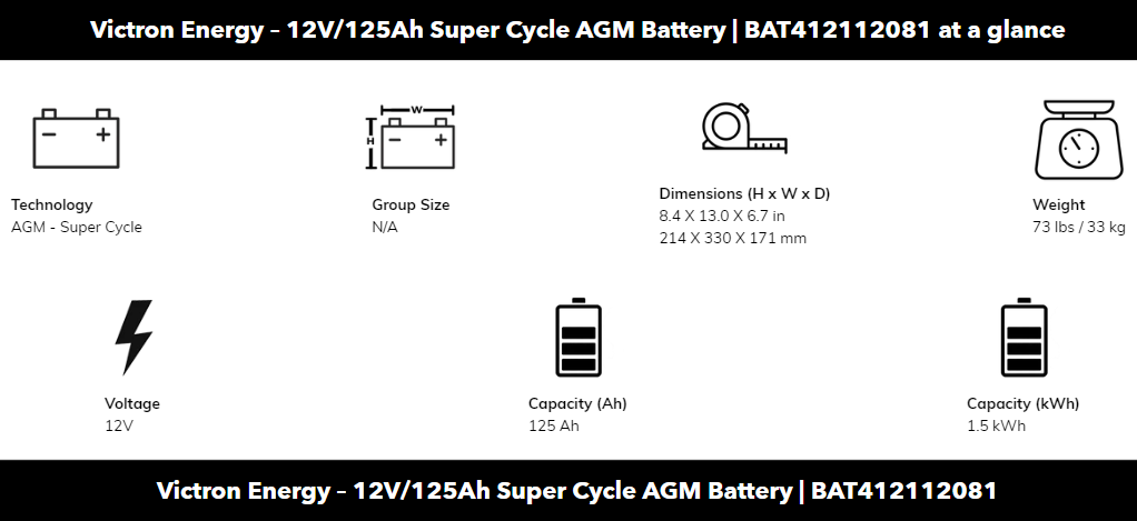 For more detailed specifications, download the Victron Energy 12V/125Ah Super Cycle AGM Battery Data Sheet
