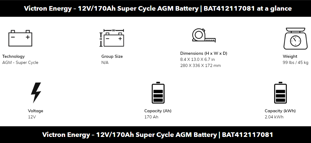 The Victron Energy – 12V/170Ah Super Cycle AGM Battery incorporates recent advancements in battery electrochemistry. This innovative battery design includes a positive plate paste that is less sensitive to softening, even with repeated 100% discharges, and new additives in the electrolyte to reduce sulfation during deep discharges.