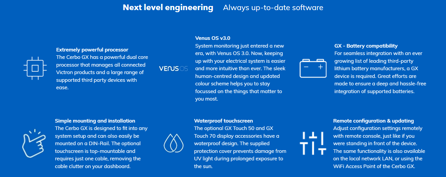 Links with all Victron Smart products and a wide range of third-party devices (like generators, BMS, and tank sensors). -