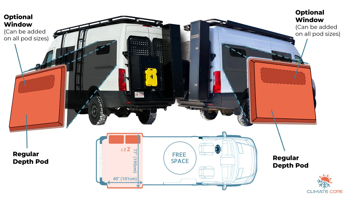 If there’s one place you should never compromise on insulation, it’s your sleeping area. ClimateCore PODS deliver outstanding thermal performance, increase usable space, and add value to your van—inside and out.