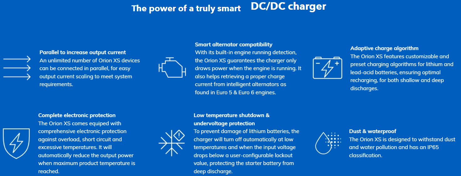 ntelligent alternators (as found in Euro 5/6 engines) do not continuously provide a high enough voltage. The Orion XS boosts this voltage to the perfect charging level.Regardless of the variable input voltage, lower or higher, the Orion XS charger maintains the chosen charging algorithm for perfect battery charging. The adjustable output current means the right charge current can be chosen for any service battery.