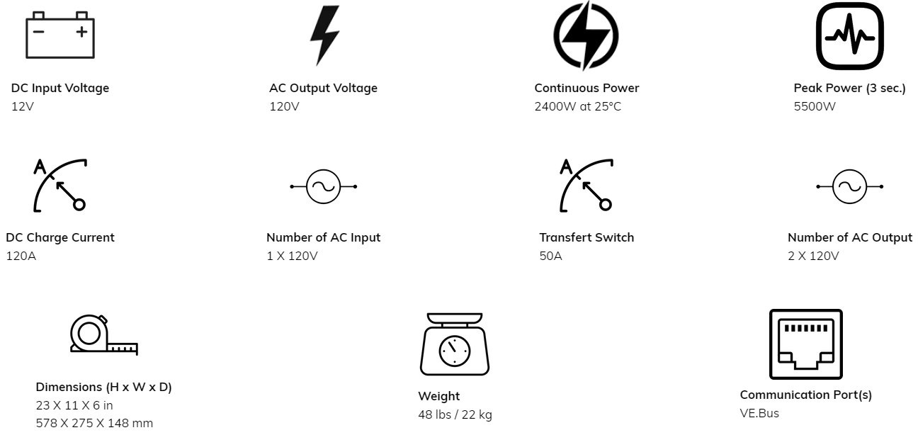 The MultiPlus-II 2x 120V has all of the expected features of our versatile inverter/charger range, including PowerControl, PowerAssist, Input Current Limit, two AC outputs, as well as parallel and 3ph configuration for larger capacity VE.Bus systems. Suitable for LiFePO4 batteries and a variety of other battery technologies.