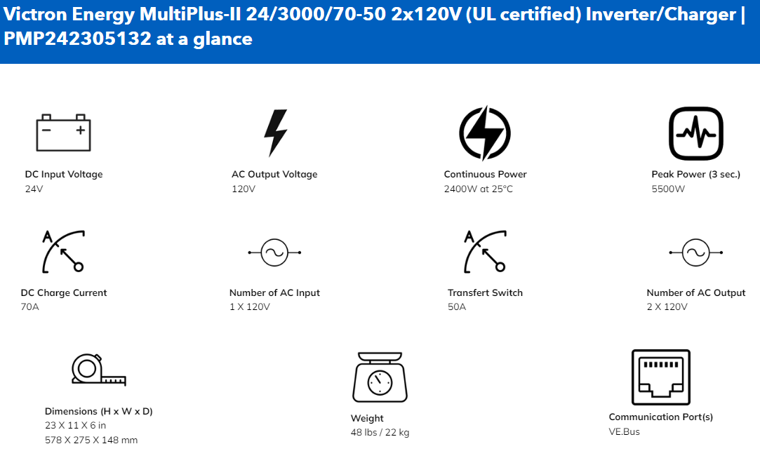 The Victron MultiPlus-II 2x 120V is the ultimate North American mobile power solution—offering intelligent control, seamless operation, and scalable power for complex off-grid or hybrid systems.