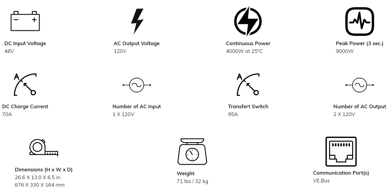Up to 6 Multis can operate in parallel to achieve higher power output. Six 48/3000/35 units, for example, will provide 15 kW / 18 kVA output power with 210 Amps charging capacity.