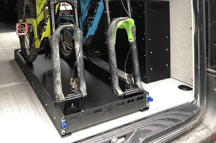 When we designed the Pull Out Tray we wanted to make sure it could accommodate the wide range of gear that’s stored in the garage area of adventure vans. The trays are large enough to hold two full-size mountain bikes using the Rocky Mounts fork bike mounts. We’ve also had customers use it to store coolers and even their grilling setup.